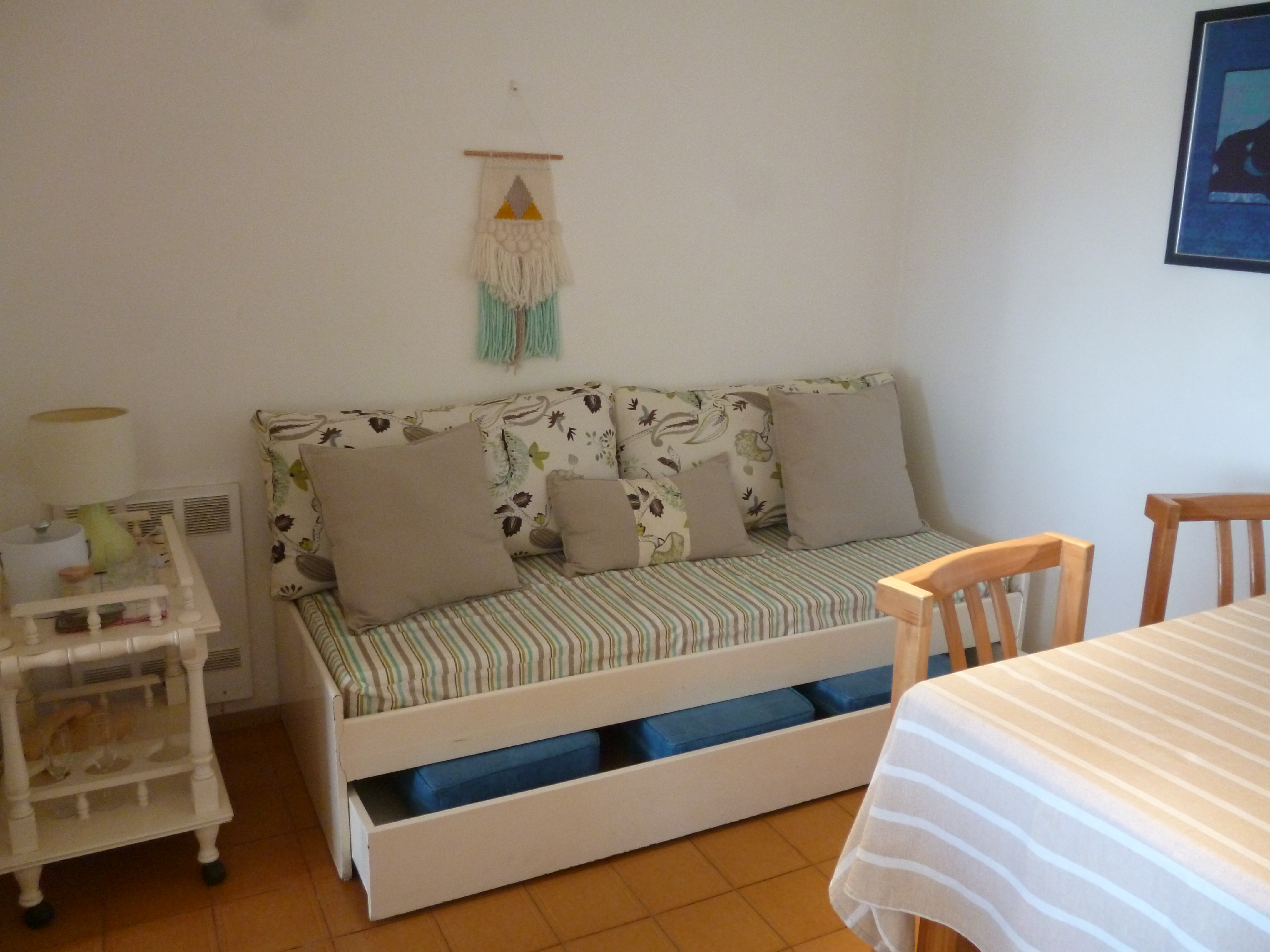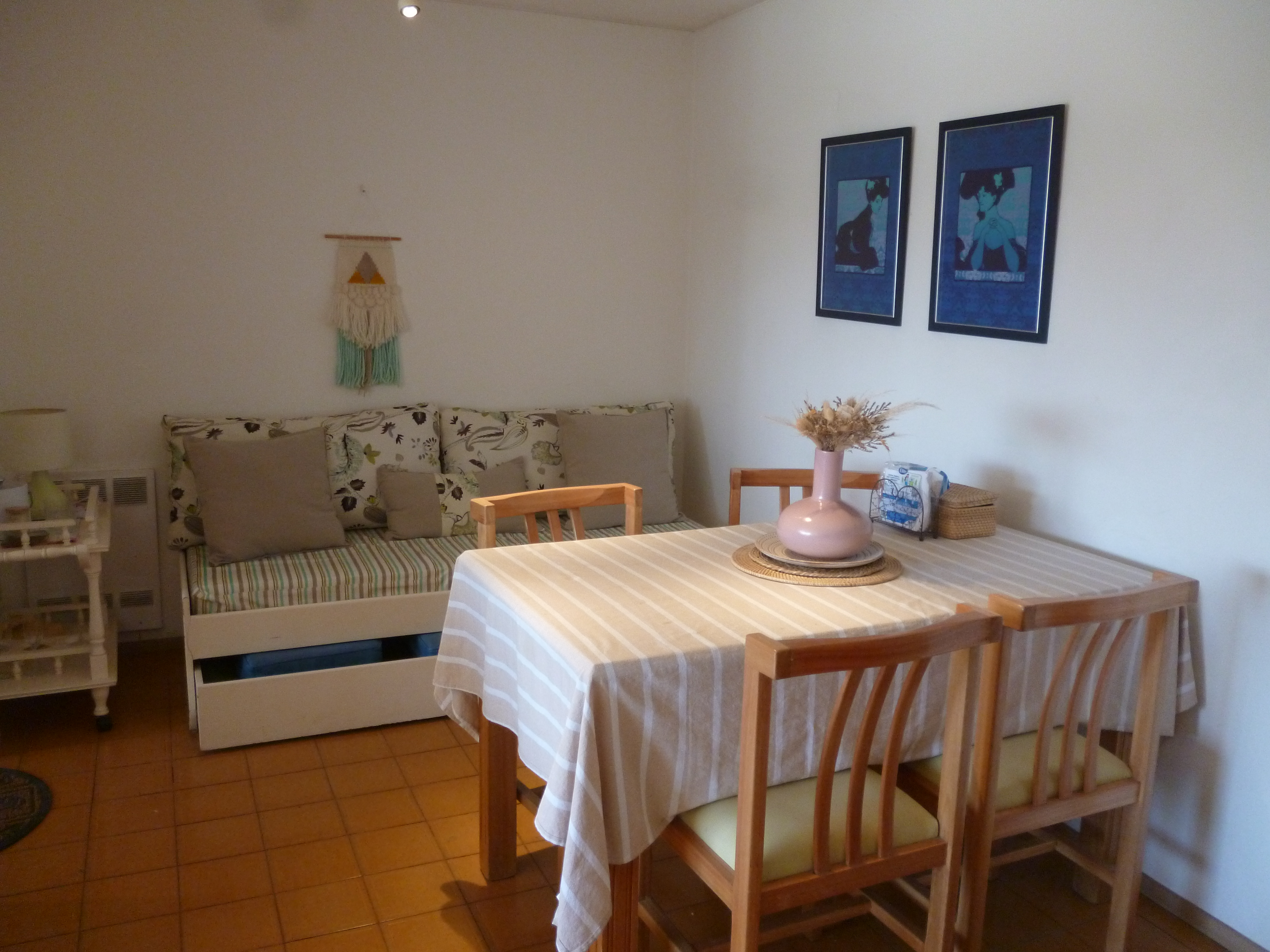 Junto a la mesa hay un sofá cama adicional.